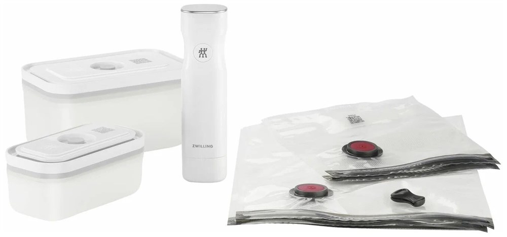 Стартовый набор S/M: вот что такое универсальность на вкус. Многим приходится обрабатывать свежие продукты у себя на кухне. Но уже через несколько дней свежесть зачастую пропадает: мясо бледнеет, листья на салате опадают. Так не должно быть! Откройте для себя новую стойкую свежесть со стартовым набором S/M из серии ZWILLING FRESH & SAVE. Делайте покупки один раз - наслаждайтесь свежестью каждый день! Удобный инновационный вакуумный насос удаляет воздух из вакуумных контейнеров и пакетов, входящих в набор, одним нажатием кнопки и сберегает ароматы, витамины и питательные вещества благодаря своей герметичности и устойчивости к посторонним запахам. Ваши продукты и блюда будут оставаться свежими до пяти раз дольше, чем при обычном хранении без вакуума! Помимо высококачественного ручного вакуумного насоса, в комплект входят два сверхлегких, умных пластиковых контейнера емкостью 0,4 и 1,1 литра, а также четыре вакуумных пакета - два по 1,25 литра и два по 4 литра. Все вакуумные контейнеры и пакеты подходят для использования в холодильнике и морозилке, а также для разогрева продуктов и блюд в микроволновой печи. Особенности: Функция откачки воздуха: продукты сохраняются свежими до пяти раз дольше, чем при обычном хранении без вакуума: ароматы и питательные вещества надежно сберегаются, количество пищевых отходов сокращается. Легкие и небьющиеся вакуумные боксы для компактного штабелируемого хранения продуктов и готовых блюд в холодильнике и морозилке. Пластиковые контейнеры можно складывать друг в друга в кухонном шкафу, когда они не используются.Безопасное замораживание продуктов и готовых блюд (отсутствие морозильных ож