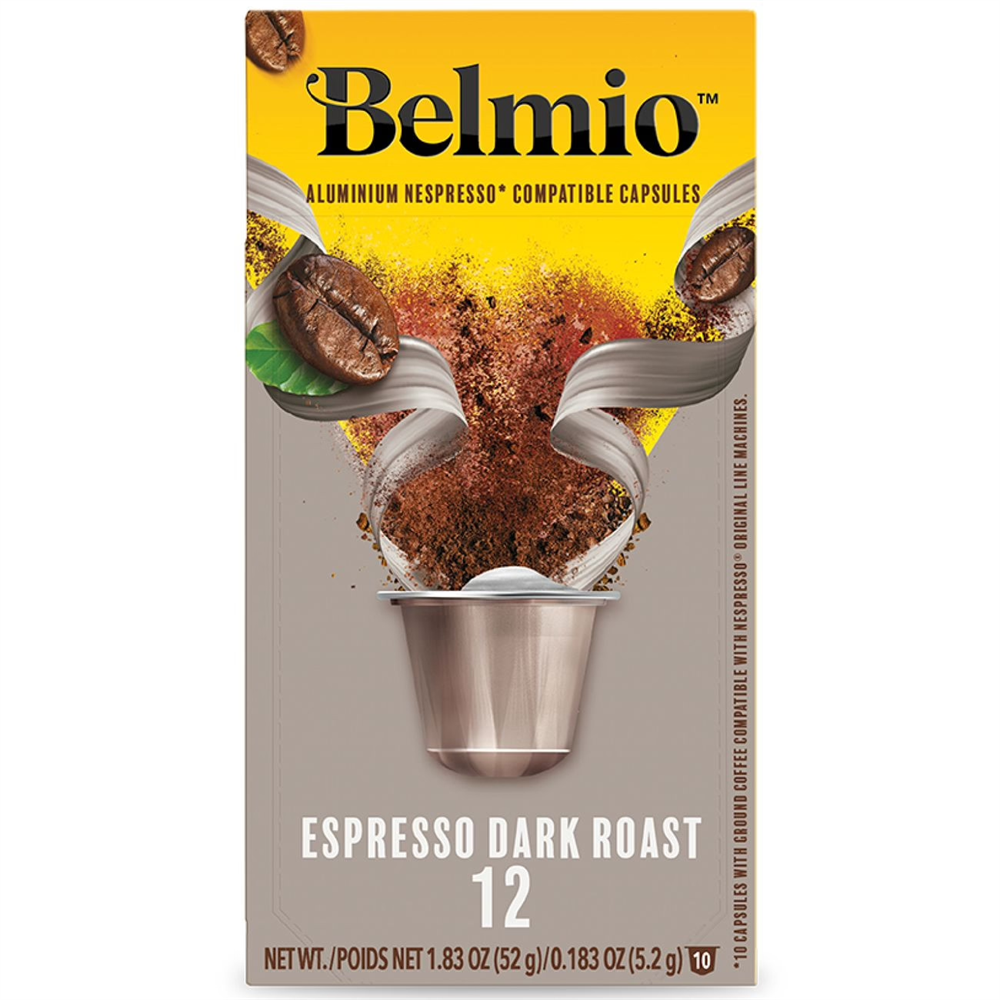 Кофе Belmio Espresso Dark Roast (intensity 12) представлен в капсулах из экологически безопасного алюминия, который сохраняет аромат молотых зерен. Темная обжарка способствует получению яркого, крепкого и насыщенного вкуса. При приготовлении напитка сверху образуется мягкая кофейная пенка. Страна производства — Бельгия. В составе присутствует 60% «Арабики» и 40% «Робусты». Набор состоит из 10 капсул, совместимых с кофемашинами Nespresso. Объем готового напитка равен 25 мл.