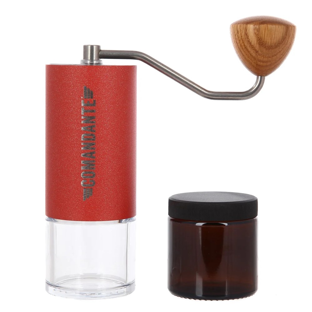 Классический лаконичный дизайн кофемолки COMANDANTE C40 стал символом качества помола мирового уровня. Простота в использовании и безупречное функционирование новейших жерновов NITRO BLADE® в кофемолках COMANDANTE® сделали их лучшим выбором для истинных любителей кофе во всем мире, начиная от производителей кофе и страстных домашних бариста до чемпионов мира по приготовлению кофе. NITRO BLADE® — это результат многолетних исследований и разработок и первые в мире семиугольные конические жернова, созданные специально для specialty кофе. Уникальные физические и химические свойства этих жерновов выгодно отличают COMANDANTE C40 от других ручных кофемолок как по производительности, так и по вкусовым качествам приготовленного кофе. Профессиональная ручная кофемолка с ярким корпусом от известной немецкой компании Comandante. Конические стальные жернова и высокоточная регулировка степени помола. Аксессуар разработан в Германии специально для экспертов, профессиональных бариста и знатоков кофе. Nitro Blade - система особо прочных жерновов, изготовленных из цельного куска стали, насыщенных азотом, что делает их устойчивыми к коррозии. Особенности:Легкая — 740 гДолговечнаяКачественный материалРучка и корпус изготовлены из натурального дереваБлагодаря фиксации центральной оси с помощью двух шариковых подшипников быстро и точно смалывает кофе Comandante C40 MK4 Nitro Blade — версия одной из лучших кофемолок в мире. Надежная и высокоточная кофемолка с широким диапазоном помола, сочетающая высокое качество материалов с лаконичным и стильным дизайном. поколение кофемолок Comandante MK4 включает в себя несколько обновлений:Более высокая производительность, прочность и никаких застрявших зерен, благодаря обновленным форме и материалам камеры кофемолкиВ комплект входят две баночки: из коричневого стекла и прозрачного небьющегося полимерного стекла