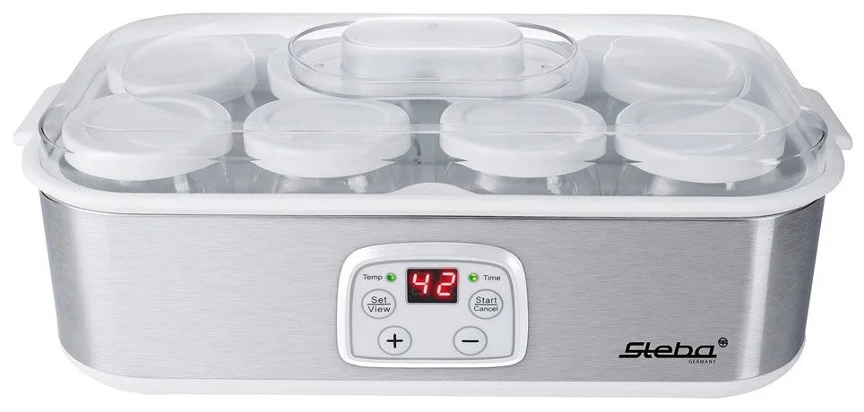 Управление: электронное; Индикация режимов работы: есть; Мощность: 25; Цвет корпуса: стальной; Материал корпуса: металл, пластик; Прочие особенности и свойства: Приготовление домашнего йогурта, Корпус в вставкой из нерж. стали, 8 стеклянных баночек (180 мл), Общий объем йогурта 1.4 л, Установка температуры 20-50 градусов, Таймер 1-48 часов, Дисплей; Размеры: 365 x 185 x 145 мм; Вес: 2,1ХарактеристикиТипйогуртницаУправлениеэлектронноеПринцип работыпостоянный нагревМатериал корпусаметалл/пластикМатериал баночекстеклоКоличество баночек8, емкостью 180 млДисплейестьТаймересть, время установки до 48 чИндикатор работыестьМощность25 Вт